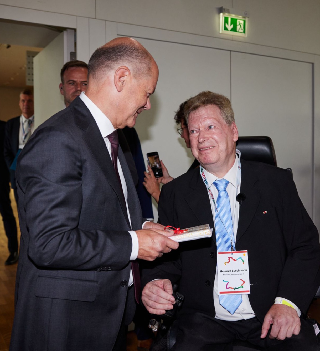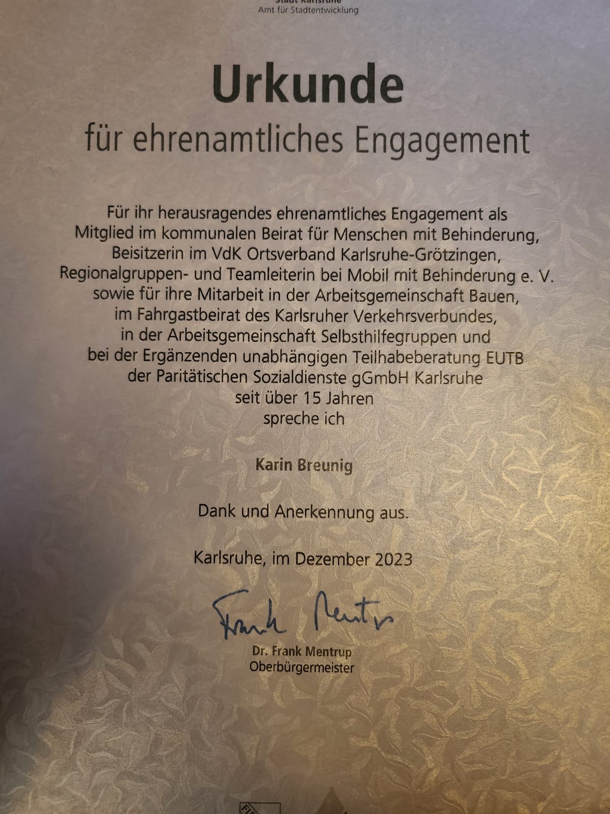 Rosemarie Böing präsentiert im Rollstuhl sitzend ihre Urkunde