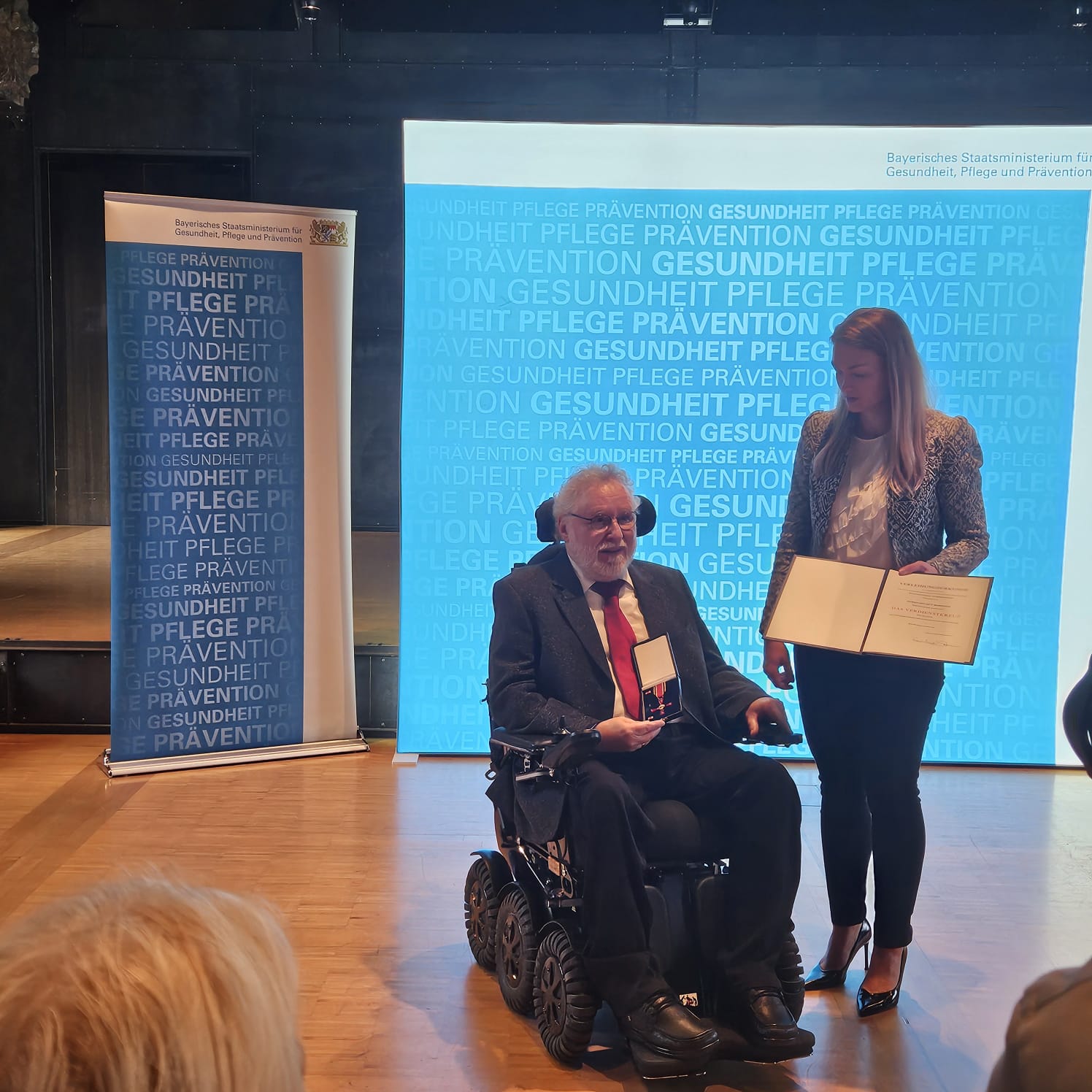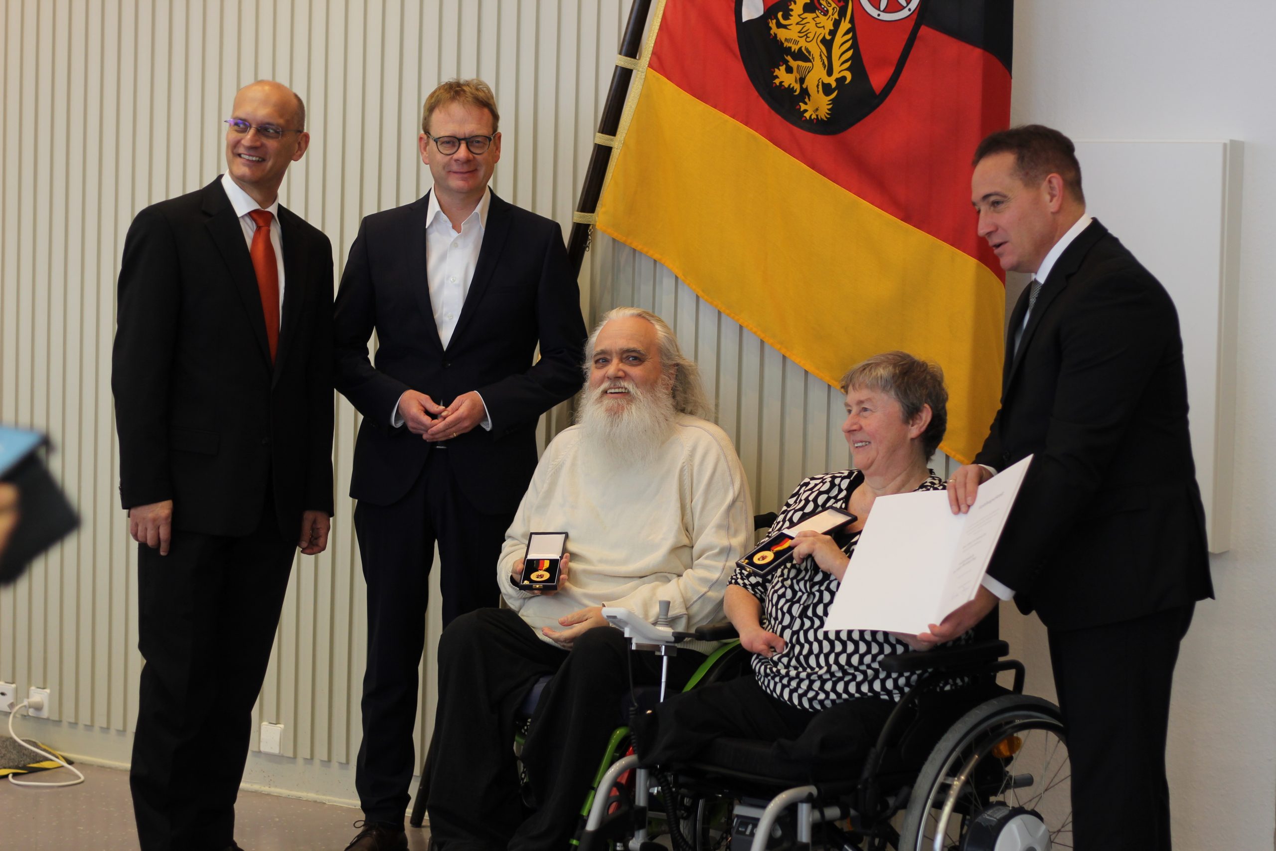 Erika Naumer-Klein und Robert Schneider sitzend im Rollstuhl mit ihren Verdienstorden in der Hand. Dahinter die Laudatoren und die Landesflagge von Rheinland-Pfalz.