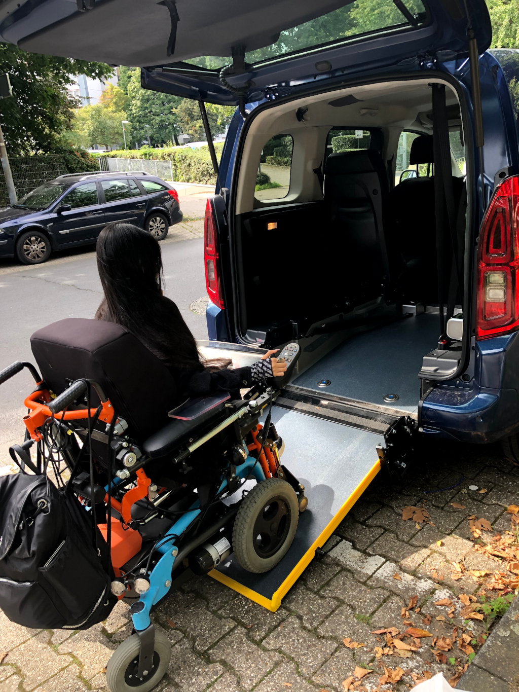 Frau in Elektrorollstuhl fährt über eine Rampe in Transportfahrzeug